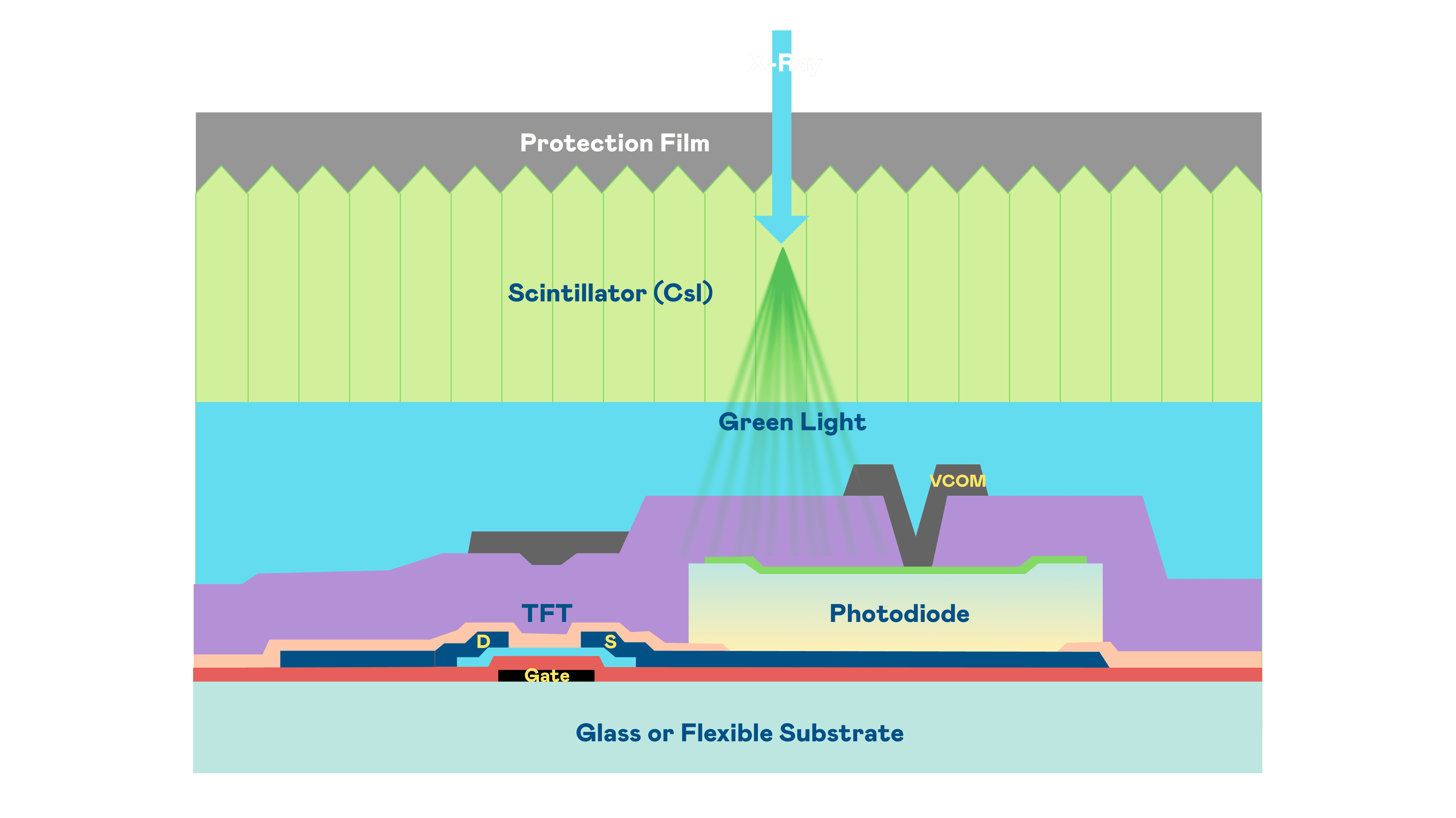 牛牛游戏的X光影像感测阵列使用薄膜电晶体 (TFT) 作为每个像素的读取开关,,,搭配光电二极体(Photodiode)的光电转换元件,,,用以感测X光影像讯号。。